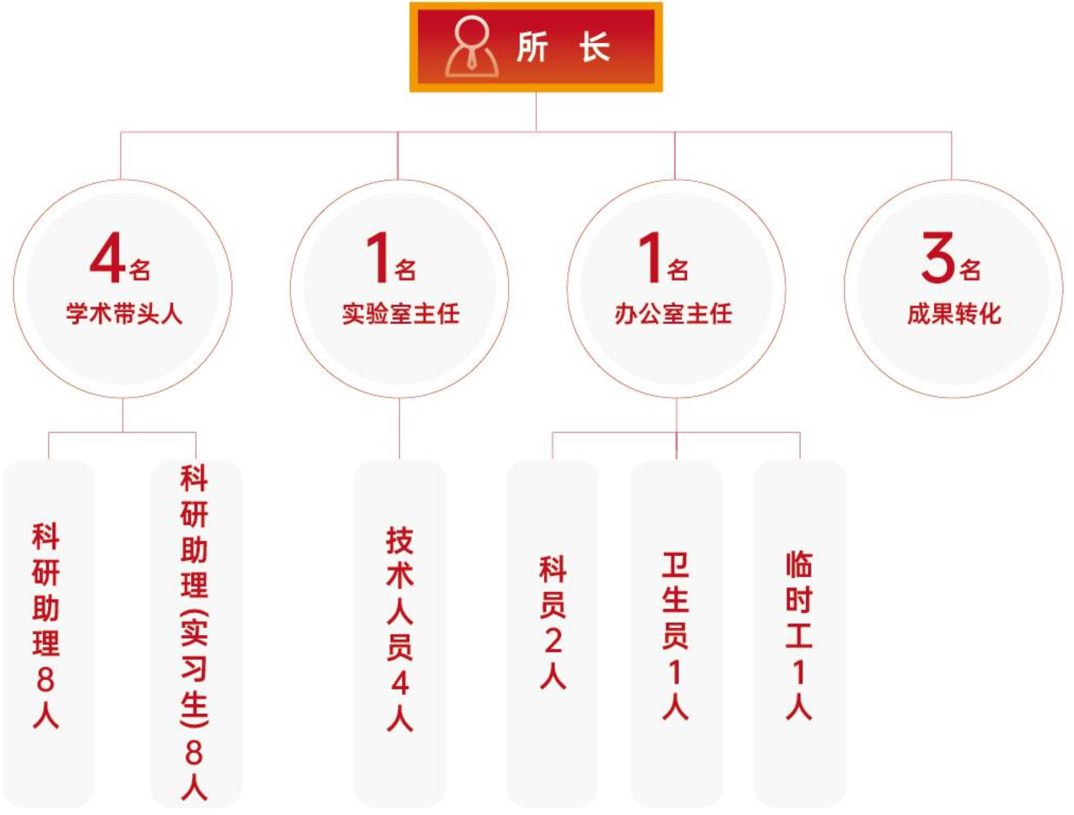 研究所⽬前在职⼈员 30 ⼈,科研⼈员 17 ⼈,技术⼈员 5 ⼈,⾏政⼈员 5 ⼈,成果转化 4 ⼈,形成了由学术带头⼈带领研究助理,配备科研协助岗,同时技术岗及⾏政岗给予技术⽀持及后勤保障的⼈员组织架构。
